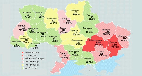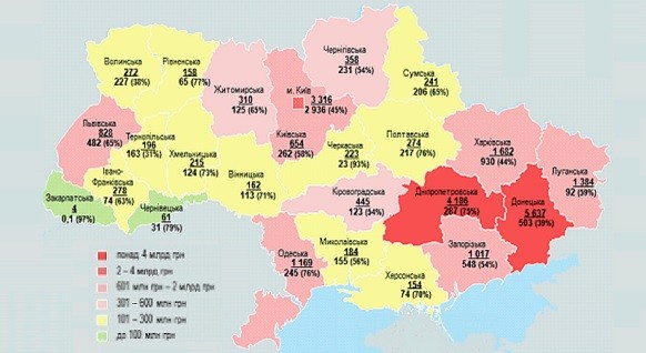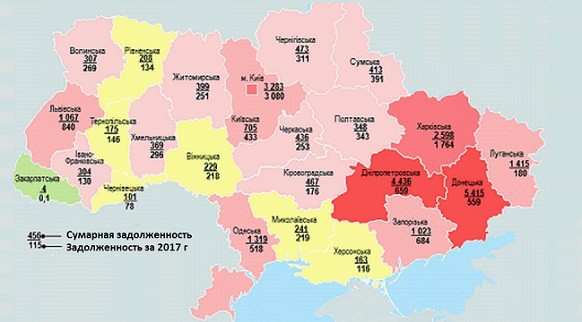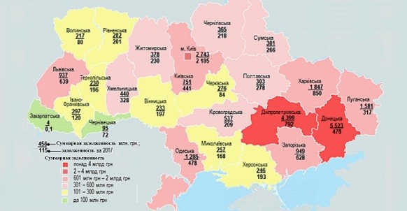 Наибольшая суммарная задолженность за потребленный газ в этой категории накоплена предприятиями ТКЭ и ТЭЦ подконтрольной Украине территории Донецкой (5,5 млрд грн), Харьковской (1,8 млрд грн), Днепропетровской (4,4 млрд грн), Луганской (1,6 млрд грн), Одесской (1,3 млрд грн) областей и г Киева (2,7 млрд грн).