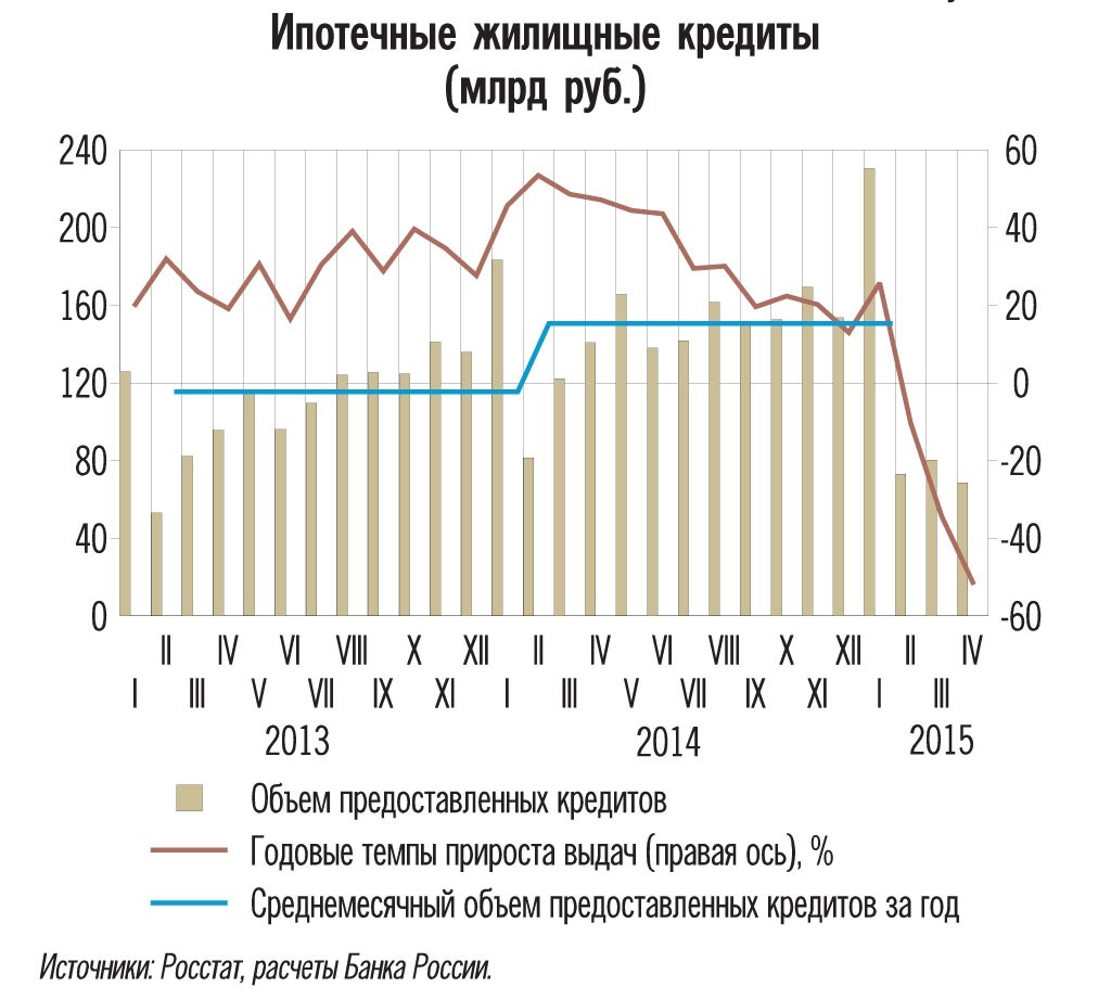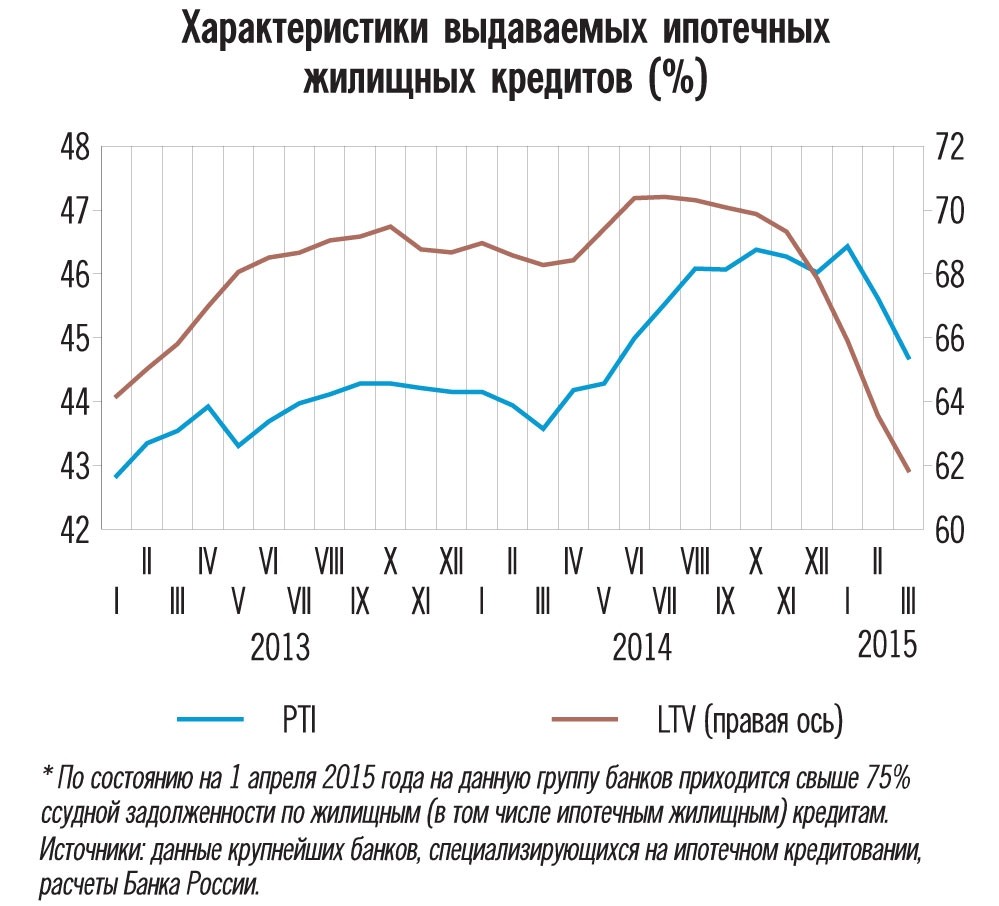 В обзоре финансовой стабильности отмечается, что ужесточение требований при кредитовании в совокупности с ростом процентных ставок по ипотечным кредитам привело к снижению спроса на данный вид кредитования в первом квартале 2015 года. По данным Банка России, уже в январе 2015 года объем предоставленных рублевых кредитов был на 10% меньше аналогичного периода 2014 года. За январь-февраль снижение составило 25%, а по итогам первого квартала — 35%. Новые кредиты выдаются с первоначальным взносом более 20%.