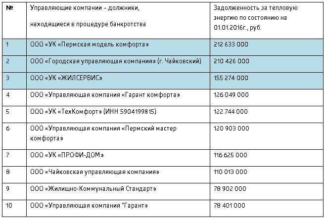 Среди городов региона крупнейшие долги имеют потребители Перми: общая задолженность 6,7 млрд рублей, из которых 5,5 млрд рублей накопили УК и ТСЖ. Также непростая ситуация с неоплатами за энергоресурс сложилась по итогам года в г. Чайковский, где из общей суммы задолженности в 909 млн рублей 786 млн рублей (86%) имеют управляющие компании. Антирейтинг крупнейших должников в Прикамье возглавляют ООО УК "Пермская модель комфорта" с долгом 212,6 млн рублей, ООО "УК "ТехКомфорт" – 134,6 млн рублей, ООО "УК "Моторостроитель" – 131 млн рублей.