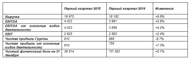 - EBITDA от основных видов деятельности: 4 023 миллиона евро (по сравнению с 3 859 миллионами евро в первом квартале 2014 года, +4,2%);