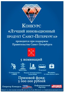 В августе 2015 года начинается прием заявок на участие в Конкурсе "Лучший инновационный продукт Санкт-Петербурга" в 2015 году. Ведущие компании города, занимающиеся производством и реализацией инновационной продукции, поборются за звание победителя, что будет отмечено денежной премией Правительства Санкт-Петербурга.Участники конкурса представят собственную продукцию в пяти номинациях: Строительство и жилищное хозяйство, Транспорт, Медицина и социальная сфера, Товары промышленного назначения и Энергетика. Организаторы конкурса – Комитет по промышленной политике и инновациям – намерены определить победителей в каждой номинации, которые займут 1,2 и 3-е места и получат денежные премии в размере: 500 000 (пятьсот тысяч), 300 000 (триста тысяч) и 200 000 (двести тысяч) рублей соответственно. Таким образом, общий призовой фонд конкурса составит 5 000 000 (пять миллионов) рублей.
