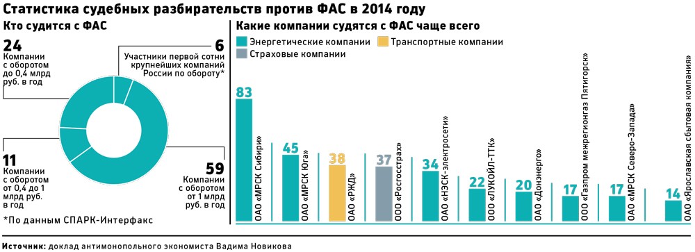 Больше всего с Федеральной антимонопольной службой (ФАС) в прошлом году судились ОАО "МРСК Сибири" (83 спора), ОАО "МРСК Юга" (45) и железнодорожный монополист РЖД (38). На компанию Владимира Якунина приходится и самый крупный оспоренный штраф — 2,27 млрд руб. Эти цифры содержатся в докладе антимонопольного эксперта РАНХиГС Вадима Новикова — он проанализировал судебные споры компаний с ФАС, по которым суд первой инстанции принял решение в 2014 году.