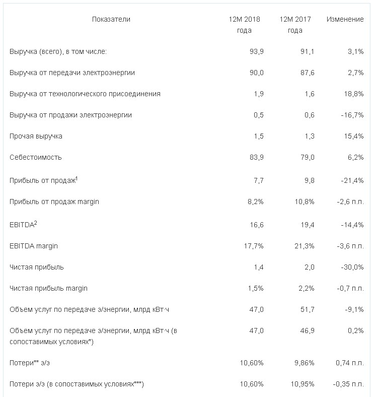Выручка за услуги по передаче электроэнергии за 2018 год увеличилась на 2,7%, данный рост обусловлен приростом среднего тарифа на 10,6% и исключением из расчета определения величины выручки стоимости нагрузочных потерь с 01.08.2017 на 1,9 млрд рублей. Основной рост выручки за услуги по передаче электроэнергии отмечен в филиалах "Воронежэнерго" и "Смоленскэнерго".
