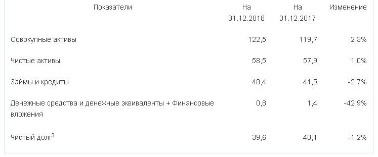 Совокупные активы компании по состоянию на 31 декабря 2018 года составили 122,5 млрд рублей. Чистые активы компании увеличились до 58,5 млрд рублей. Чистый долг3 снизился и составил 39,6 млрд рублей (на 31 декабря 2017 года – 40,1 млрд рублей).