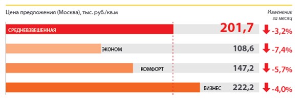 Средневзвешенная цена предложения составила 201,7 тыс. руб. за кв. м (минус 3,2% в течение месяца), что соответствует 3025 долл за кв. м (минус 3,2%). Стоит отметить, что по сравнению с аналогичным периодом прошлого года положительная динамика средней цены наблюдается только в экономклассе - на 2,9%. За прошедший месяц цена квадратного метра снизилась по всем классам жилой недвижимости в пределах от 4 до 7,4%.