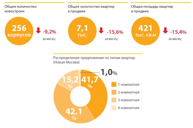 Общее количество новостроек сократилось на 9,21% и составило 256 корпусов. Такие изменения связаны с тем, что в условиях отсутствия в мае новых корпусов и объектов в продаже на территории Новой Москвы, выходят из реализации ранее строившиеся корпуса. В мае на рынок Новой Москвы не был выведен ни один новый проект, как собственно и новых корпусов, поступивших в реализацию, зарегистрировано не было.