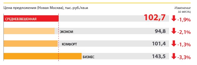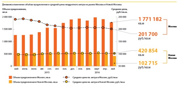 В мае 2016 года средневзвешенная цена предложения на рынке Новой Москвы снизилась на 1,9% и составила 102,7 тыс. руб. за кв. м (1 540 долл. за кв. м).