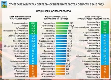 Вторая колонка – это динамика производства, то есть прирост к 2014 году. Мы видим, что наибольший вклад в прирост промышленного производства за прошлый год приходится на Ровеньский район, Ракитянский, Прохоровский, город Белгород, Корочанский район. Аутсайдерами являются Грайворон, Вейделевский район, Чернянский район, Белгородский район, к сожалению, - 84 процента. Объём промышленного производства на душу населения представлен в правой колонке. Самый высокий в Корочанском районе, второе место Ракитянский, третье Алексеевский, четвёртое Губкинский, пятое Старооскольский городской округ. И самое низкое у нас промышленное производство на душу населения в Белгородском, Ровеньском, Грайворонском, Вейделевском и Красненском районах.