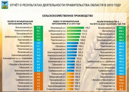 Из неё видно, по объёмам производства продукции сельского хозяйства лидируют Волоконовский район, Новооскольский, Прохоровский, Шебекинский, Корочанский. Самые низкие объёмы производства продукции сельского хозяйства в Вейделевском, Чернянском, Грайворонском, Ровеньском, Борисовском, Красненском районах. Как выглядела динамика производства в прошлом году, видно из второй колонки. Самый большой прирост к уровню 2014 года получен в Яковлевском районе, Шебекинском, Борисовском, Красненском, Ракитянском районах. Все районы в целом сработали с положительной динамикой.