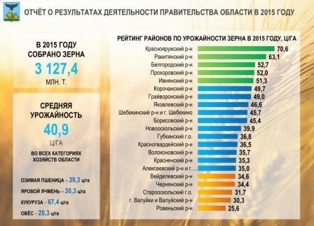 Лидерами являются Краснояружский район, Ракитянский, Белгородский, Прохоровский, Ивнянский, где получено более 50 ц/га, в Краснояружском – свыше 70 ц/га. В числе отстающих – Вейделевский, Чернянский, Старооскольский, Валуйский, Ровеньский районы, где получено ниже 35 ц/га, то есть в 2,5 раза ниже, чем у лидеров. Я думаю, что здесь есть над чем задуматься и районам отстающим, их руководителям и специалистам, которые работают в сельском хозяйстве.