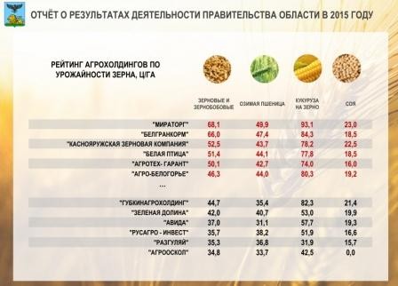 Вы видите, что здесь лидирует компания "Мираторг", затем "Белгранкорм", "Краснояружская зерновая компания". В числе крепких середняков "Белая птица", "Агротех-Гарант", "Агро-Белогорье". Среди отстающих – "Губкинагрохолдинг", "Зелёная долина", "Авида", "Русагро-Инвест", "Разгуляй" и "АгроОскол". "АгроОскол" – это в Алексеевском районе – получил всего 35 ц/га, в то время как рядом в этом же районе "Агротех-Гарант" получил свыше 50 ц/га. Тоже, думаю, есть над чем работать и вскрывать наши резервы по повышению урожайности и валовых сборов зерна.