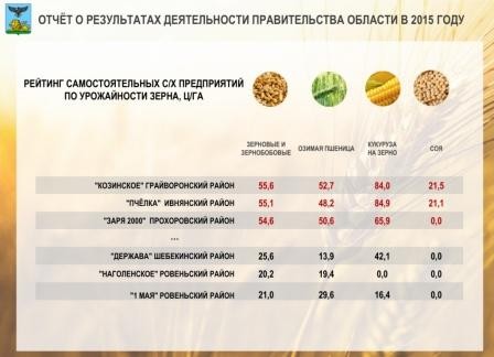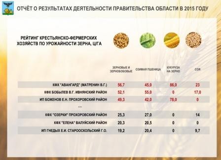 Лидирует здесь Матрёнин В.Г, это крестьянско-фермерское хозяйство Шебекинского района "Авангард". Высокий урожай получен у Бобылева В.Г. в Ивнянском районе и в индивидуальном предприятии Боженова Е.Н. в Прохоровском районе. Среди отстающих крестьянско-фермерские хозяйства "Озерки" Прохоровский район, "Елена" в Валуйском районе и индивидуальное предприятие Гнедых Е.И., Старооскольский городской округ. Фамилию Гнедых немножко компрометирует. Думаю, Александру Викторовичу (Гнедых А.В. – глава администрации Старооскольского городского округа) нужно разобраться и помочь однофамильцу выйти в передовики.