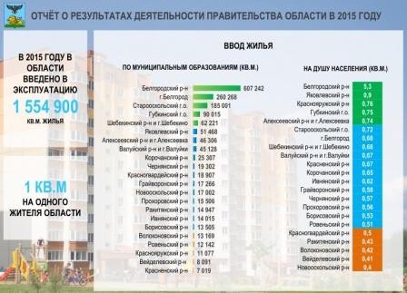 Вы видите, по муниципальным образованиям лидируют, естественно, Белгородский район, г. Белгород, Старооскольский городской округ, Губкинский городской округ. А вот с правой стороны у нас интересные данные представлены – это ввод жилья на одного жителя по муниципальным образованиям. По-прежнему лидирует Белгородский район, где 5,3 кв. метра на одного жителя, Яковлевский, Краснояружский, Губкинский и Алексеевский районы, отстающие – Красногвардейский район, Ракитянский, Волоконовский, Вейделевский и Новооскольский районы, где введено в прошлом году на одного жителя менее полуметра.