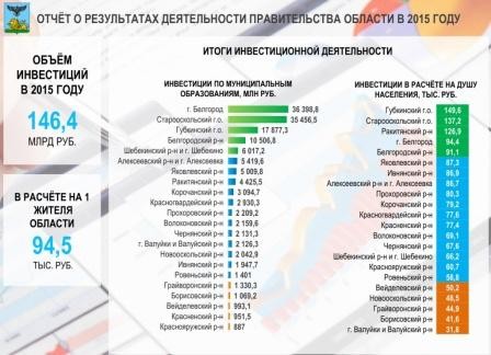 Здесь с левой стороны инвестиции по муниципальным образованиям в прошлом году: лидирует г. Белгород – 36,4 млрд рублей, за ним Старооскольский городской округ, Губкин, Белгородский район, Шебекинский район, в числе отстающих – Грайворон, Борисовка, Вейделевский, Красненский и Краснояружский районы. А вот в инвестициях в расчёте на душу населения у нас лидирует Губкинский городской округ, за ним Старооскольский, Ракитянский район и г. Белгород, среди отстающих – Вейделевский, Новооскольский, Грайворонский, Борисовский и Валуйский районы. В текущем году планируется освоить не менее 150 млрд рублей инвестиций, то есть не ниже уровня прошлого года.