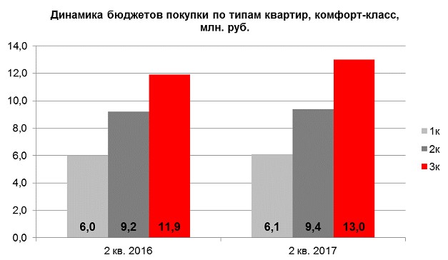 Бюджет на покупку трехкомнатных квартир и апартаментов комфорт-класса существенно вырос – на 9%, сейчас он находится на уровне 13 млн рублей.