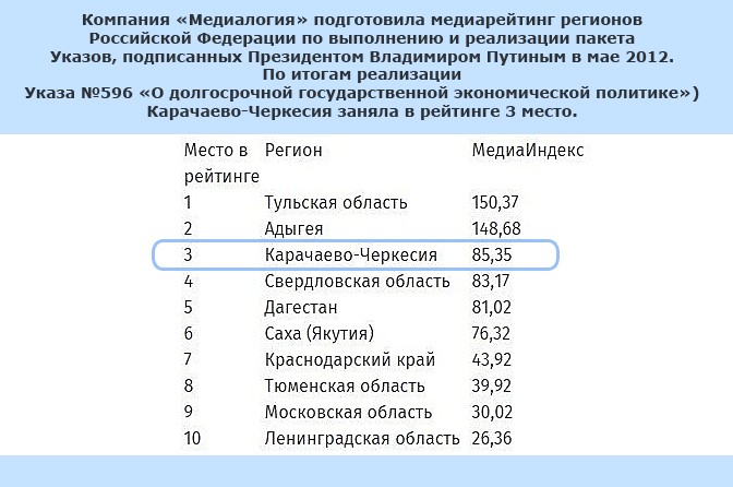 В первую десятку рейтинга, успешно реализующих "Майский" Указ в сфере экономики, вошли Тульская область, Адыгея, Карачаево-Черкесия, Свердловская область, Дагестан Саха (Якутия), Краснодарский край, Тюменская область, Московская область, Ленинградская область.