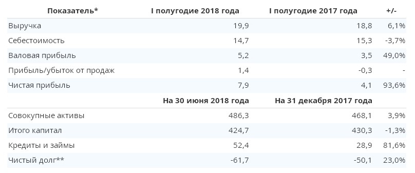 Валовая прибыль за I полугодие 2018 года составила 5,2 млрд рублей против 3,5 млрд рублей за аналогичный период прошлого года.