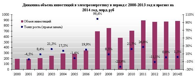 Моральная и физическая изношенность оборудования (около 65%) – ещё один балласт, который препятствует подъёму отрасли. В такой ситуации особое внимание участников рынка приковано к деятельности и проектам, которые способны оздоровить и вывести на новый уровень отечественную энергетику. В специальном обзоре "Энергетика и электротехника. Инвестиционные проекты строительства электростанций и заводов электротехнических изделий" специалисты "INFOLine" отмечают, что объем инвестирования заметно увеличился в 2007 году. Тогда он достиг 693 млрд. руб., что обусловлено окончанием реформирования "РАО ЕЭС России", проведением акционирования обществ и подписанием первых договоров ДПМ. За счет привлечения в электроэнергетику частных инвесторов в 2007–2011 годах ежегодный объем инвестиций достиг отметки в 900 млрд. руб. В 2012-2013 годы объем инвестиций составил около 870 млрд. руб. Плановый объем инвестиций в электроэнергетику на 2014 год составляет 883,8 млрд. руб.