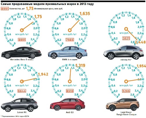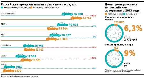 В целом по премиальном сегменту дилеры ждут повышения цен в диапазоне от 5 до 25%. Производители дорогих машин поднимают цены на фоне общего падения продаж автомобилей. По итогам десяти месяцев 2014 года, по данным Ассоциации европейского бизнеса (АЕБ), в России было продано на 12,7% меньше машин, чем за тот же период прошлого года. Но премиальный сегмент более инертный, в кризис он, как правило, сохраняет боковое движение или вообще идет против рынка. Например, продажи Lexus в январе–октябре текущего года выросли на 20%, Mercedes-Benz – на 12%, Land Rover прибавила 2%. Продажи Audi и Infiniti снижаются, но остаются выше рынка – минус 6 и 7% соответственно. У BMW снижение ниже среднего значения рынка – 15%.