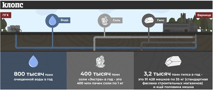 О том, как устроено производство соли — в инфографике "Клопс". Во время производства будет перерабатываться рассол, который образуется при размыве пластов каменной соли во время строительства подземного газохранилища (ПГХ). Рассол поступает на завод, где из него выпаривается соль и гипсовые примеси.