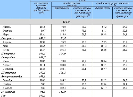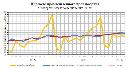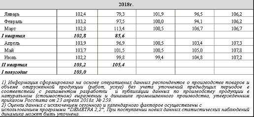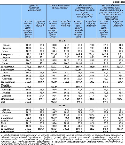 I>1) Индекс промышленного производства исчисляется по видам деятельности: "Добыча полезных ископаемых", "Обрабатывающие производства", "Обеспечение электрической энергией, газом и паром; кондиционирование воздуха", "Водоснабжение; водоотведение, организация сбора и утилизации отходов, деятельность по ликвидации загрязнений" на основе данных о динамике производства важнейших товаров-представителей (в натуральном или стоимостном выражении). В качестве весов используется структура валовой добавленной стоимости по видам экономической деятельности 2010 базисного года.I>