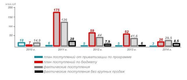Поступления в федеральный бюджет от приватизации в 2010-2014 гг. составили лишь 21% первоначального плана.