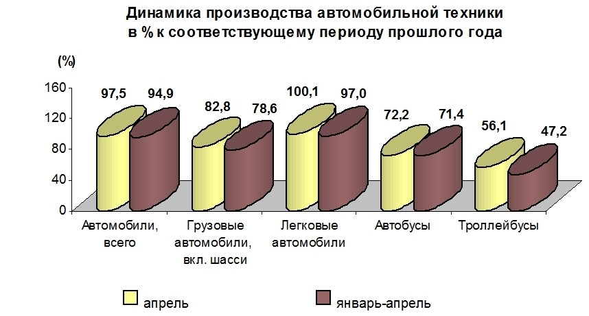 В апреле 2014 года по сравнению с мартом 2014 года наблюдается рост производства по грузовым автомобилям, автобусам и троллейбусам, снижение производства по легковым автомобилям.