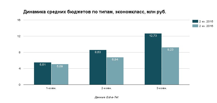 За год средний бюджет покупки многокомнатной квартиры в новостройках массового сегмента, по оценке Est-a-Tet, сократился еще сильнее, соответственно, снизился и срок накопления на полную стоимость жилья. Двухкомнатные квартиры экономкласса упали в цене в среднем на 20,7%, в комфорте — на 2,9%. На начало июня средний бюджет для экономкласса находится на уровне 6,8 млн руб., комфорт-класса — 9,2 млн руб. По расчетам Est-a-Tet на сегодня, срок накопления на "двушку" в сегменте эконом доходит до 8 лет и 8 месяцев (за год снизился на 3 года и 1 месяц), в комфорт-классе — до 11 лет и 8 месяцев (за год снизился на 1 год и 4 месяца).