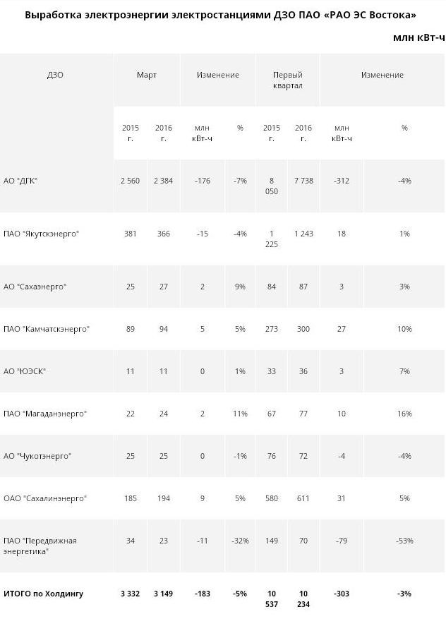 · С начала 2016 года выработка электроэнергии в России в целом составила 291,8 млрд кВт-ч, что на 1,4%% больше объема выработки в январе-марте 2015 года. На Дальнем Востоке (с учетом изолированных систем) выработка всех энергокомпаний региона составила 14,1 млрд кВт-ч, увеличившись на 2,9% к прошлому году. Доля электростанций Холдинга РАО ЭС Востока в общероссийской выработке за первые три месяца 2016 года составила 3,5%, а в выработке Дальнего Востока – 73%.