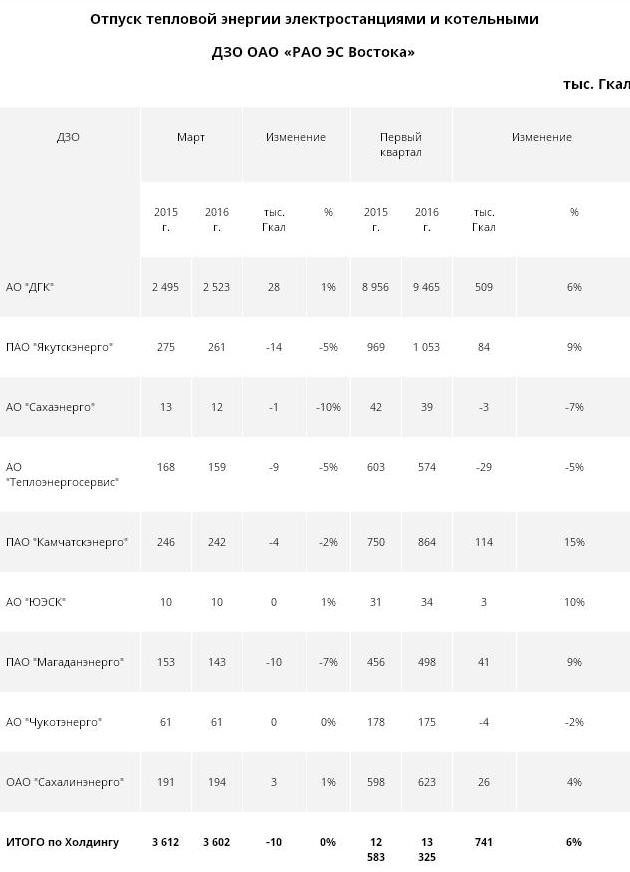 · Отпуск тепла электростанциями и котельными энергокомпаний Холдинга РАО ЭС Востока за первый квартал 2016 года составил 13 325 тыс. Гкал, что на 5,9% больше показателя аналогичного периода 2015 года.