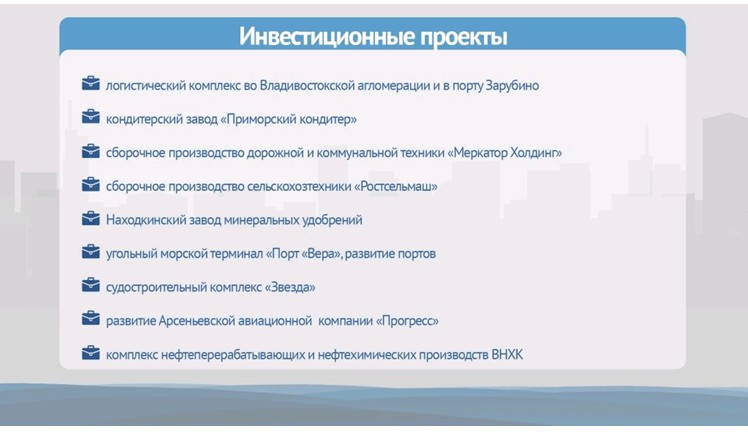 Сегодня в Приморье реализуются сотни проектов российских и зарубежных инвесторов. К настоящему времени резидентами четырех территорий опережающего развития Приморья – "Надеждинская", "Михайловский", "Большой Камень" и "Нефтехимический" – стали уже 66 компаний с общим объемом вложенных инвестиций почти три миллиарда рублей. В Свободном порту Владивосток зарегистрировано 520 компаний с заявленным объемом инвестиций около 9 миллиардов рублей. Проекты резидентов двух экономических режимов предполагают создание боле 1700 новых рабочих мест.