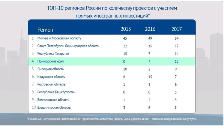Приморье вошло в топ-4 регионов России по количеству проектов с участием иностранных инвестиций.