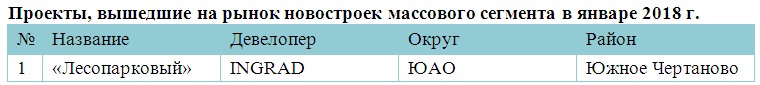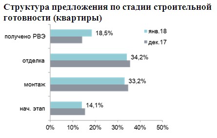 По данным "Метриум Групп", по итогам января 2018 года на первичном рынке жилья массового сегмента продажи велись в 72 комплексах, в которых экспонировалось порядка 17 710 квартир[1] (площадью 1,028 млн кв. м). В сравнении с декабрем прошлого года показатель снизился на 7,2% по числу и на 7,4% по продаваемой площади квартир. За месяц на рынок вышел один объект – ЖК "Лесопарковый" (в котором ранее велось бронирование).