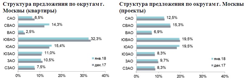 В структуре предложения по административным округам не произошло существенных изменений. Доля квартир в ЮВАО, несмотря на выход в продажу трех новых корпусов в ЖК "Некрасовка", снизилась на 1 п.п. и составила почти треть от общего объема экспонируемых лотов (32,3%). В ЮАО доля квартир находилась на уровне 15,4%. За месяц выборка в этом округе увеличилась на 1,1 п.п. за счет выхода нового проекта - "Лесопарковый". Наименьший объем предложения традиционно сосредоточен в ВАО (2,5%, -0,6 п.п.).
