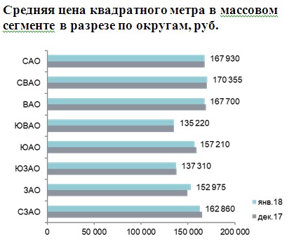 По подсчетам аналитиков "Метриум Групп", по итогам января 2018 года на рынке новостроек массового сегмента средняя цена предложения составила 151 130 руб. за кв. м (+0,2%). Наиболее заметный рост отмечен в ЗАО (+2,3%). Основная причина - уменьшение объема предложения в комплексах с ценами ниже среднерыночных. Снижение показателя произошло в СЗАО (-1,4%), ЮАО (-1,1%), ВАО (-0,9%) и ЮЗАО (-0,4%).