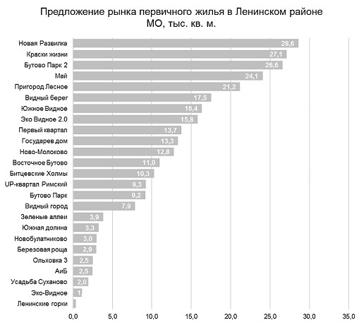 В границах городского поселения Видное реализуется 21% от общего объёма предложения рынка первичного жилья Ленинского района. Так как здесь строятся такие масштабные проекты, как ЖК "Березовая роща" (2,39 тыс. кв. м в предложении), "Битцевские Холмы" (10,3 тыс. кв. м в предложении), "Зеленые аллеи" (3,9 тыс. кв. м в предложении), "Краски жизни" (27,1 тыс. кв. м в предложении) и "Южное Видное" (16,4 тыс. кв. м в предложении).