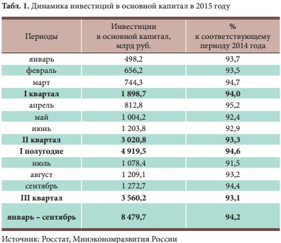 На данный момент высокие ставки по кредитам делают займы неподъемными для всего реального сектора. Стабильный отток капитала в условиях ограниченных возможностей кредитования находит отражение в динамике инвестиций. Сокращение инвестиций происходило на протяжении всего 2015 года (табл. 1). Причины этого кроются в низком потребительском спросе и в падении рентабельности производства.