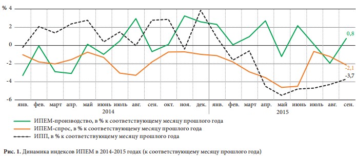 Основные результаты расчета индексов По итогам III квартала 2015 года индексы ИПЕМ продемонстрировали сонаправленную динамику. Крайне низкие результаты августа (-2%) стали причиной прогнозируемого замедления индекса ИПЕМ-производство в III квартале 2015 года (-0,4% к III кварталу 2014 года), не позволив ему сохранить позитивную направленность, несмотря на слабоположительные результаты в июле (+0,1%) и в сентябре (+0,8%). Индекс ИПЕМ-спрос в рассматриваемом периоде показал монотонно убывающее движение: снижение составило 1,3% к III кварталу прошлого года при месячных показателях индекса: -0,7% – в июле, -1,2% – в августе, -2,1% – в сентябре (рис. 1). За январь – сентябрь 2015 года индекс ИПЕМ-производство вырос на 0,6% к аналогичному периоду прошлого года. Индекс ИПЕМ-спрос уже третий год не выходит из минуса в годовом исчислении: с начала текущего года падение составило 2,5%.