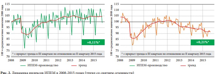 Тренды со снятием сезонности в III квартале 2015 года фиксируют разнонаправленное движение индексов производства и спроса (рис. 2). Индекс ИПЕМ-производство, очищенный от сезонного фактора, устремился к новому локальному минимуму, динамика тренда сменилась на монотонно убывающую. Тренд индекса ИПЕМ-спрос демонстрирует незначительный рост постепенно затухающими темпами на протяжении всего рассматриваемого периода.