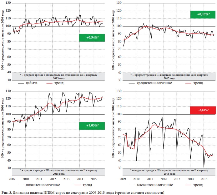 Значения индекса ИПЕМ-спрос в разрезе секторов за III квартал 2015 года по отношению к соответствующему периоду прошлого года показывают, что рост спроса в годовом исчислении наблюдается только в добывающих отраслях (рис. 3), хотя за последний квартал положительная динамика прослеживалась и в низкотехнологичных отраслях: