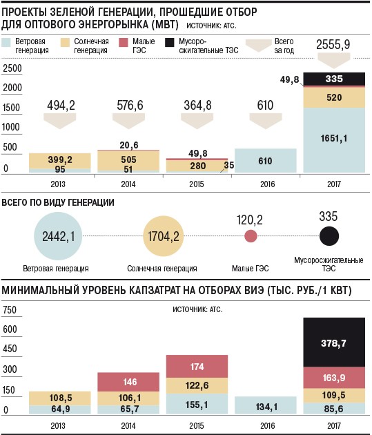 Отбор проектов происходит по наименьшему CAPEX, но до этого года конкуренция по цене была низкой. Лишь на отборе ВЭС в 2017 году CAPEX на 1 кВт мощности упал на 30% из-за прихода сразу трех участников — финской Fortum, итальянской Enel и "ВетроОГК" (входит в ОТЭК "Росатома"), в секторе СЭС высокий конкурс наблюдался только в отборе 2014 года. В итоге, по данным "Совета рынка", нагрузка на потребителей будет выше прогнозной: 4,8% от общего объема торгов на оптовом рынке в 2020 году (82 млрд руб.) и 9,8% в 2024 году (174 млрд руб.). В целом в 2015–2016 годах потребители уже заплатили за зеленую энергетику 20 млрд руб., в 2017 году отдадут еще 36 млрд руб., а в 2018–2024 годах совокупно — 1,63 трлн руб.