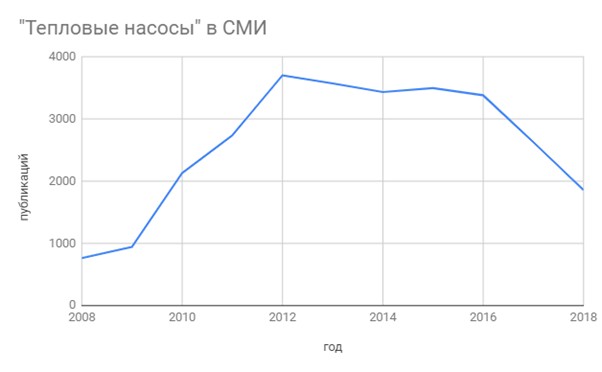 Тепловые насосы (как использующие наружный воздух, так и геотермальные), наряду с ветряными и солнечными электростанциями, являются локомотивом так называемой зелёной энергетики. В 2012 году внимание к этому классу оборудования достигло пика – 3,7 тысячи публикаций в российских СМИ. К началу 2018-го данный показатель снизился до уровня 2,6 тысячи. Динамика трёх кварталов 2018 года показывает дальнейшее снижение.