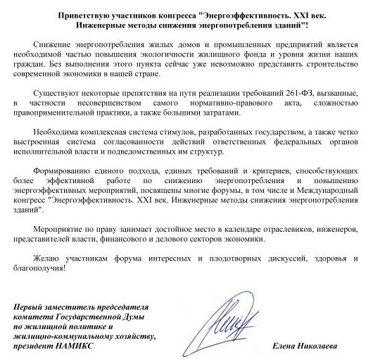 В частности, в приветствии к участникам конгресса первый заместитель председателя комитета Государственной Думы по жилищной политике и жилищно-коммунальному хозяйству, президент НАМИКС Елена Николаева отметила: