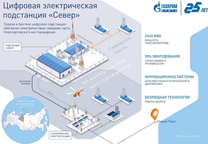 Строительство цифровой подстанции** впервые реализовано в Арктике на объектах нефтегазодобывающей отрасли в рамках национального проекта Министерства энергетики России "Разработка и внедрение цифровых электрических подстанций и станций на вновь строящихся и реконструируемых объектах энергетики". При проектировании подстанции специалисты адаптировали конструкцию здания и оборудование для работы в экстремальных климатических условиях арктического региона, применили инновационные отечественные разработки в области элегазового оборудования***.