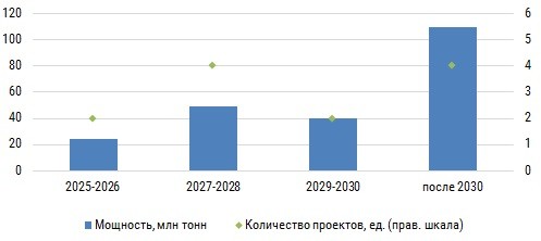По данным исследования "Рынок СПГ в России: производство, потребление, инвестиционные проекты и перспективы развития", в России запланировано строительство 14 крупнотоннажных заводов по производству СПГ, ориентирующихся, прежде всего, на экспорт. В стадии активной реализации находятся 12 проектов, среди них "Арктик СПГ-2" (ПАО "НОВАТЭК") в Ямало-Ненецком АО мощностью 19,8 млн тонн в год и вводом в эксплуатацию в 2026 г. (первая очередь в 2023 г.); завод по переработке этансодержащего газа и производству СПГ (ПАО "Газпром" и АО "РусГазДобыча") в Усть-Луге на 13,3 млн тонн в год с запуском в 2025 году; а также строительство в 2027 году "Арктик-1" (ПАО "НОВАТЭК") в ЯНАО на 19,8 млн тонн.