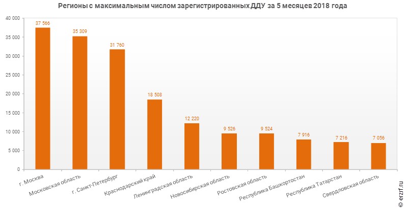 По данным Росреестра, по итогам пяти месяцев 2018 года в ТОП-10 регионов по количеству зарегистрированных договоров участия в долевом строительстве (ДДУ) вошли Москва, Московская область, Санкт-Петербург, Краснодарский край, Ленинградская область, Новосибирская область, Ростовская область, Республика Башкортостан, Республика Татарстан и Свердловская область.