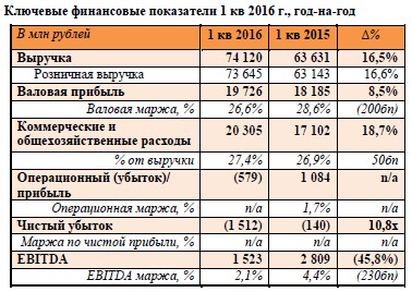 Показатель EBITDA сократился на 45,8% (на 54,8% в долларах США) год-на-год до 1,5 млрд рублей (20,4 млн долл. США) в первом квартале 2016 года. Маржа по показателю EBITDA снизилась на 230 бп год-на-год до 2,1% в первом квартале 2016 года, главным образом, в связи с вышеупомянутым снижением валовой маржи и увеличением расходов на аренду, как процента от выручки.