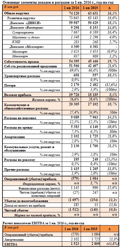 Розничная выручка дивизиона "ДИКСИ" выросла на 18,5% (сократилась на 1,3% в долларах США) год-на-год до 60,0 млрд рублей (803,8 млн долл. США) в первом квартале 2016 года. Розничная выручка дивизиона "Виктория" выросла на 14,0% (сократилась на 5,0% в долларах США) год-на-год до 9,3 млрд рублей (124,6 млн долл. США) в первом квартале 2016 года. Розничная выручка дивизиона "Мегамарт" практически не изменилась и составила 4,4 млрд рублей (58,4 млн долл. США) в первом квартале 2016 года.