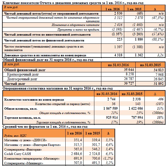 Основные показатели деятельности ГК "ДИКСИ" за 1 квартал 2016 года: