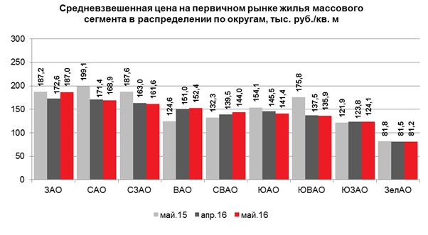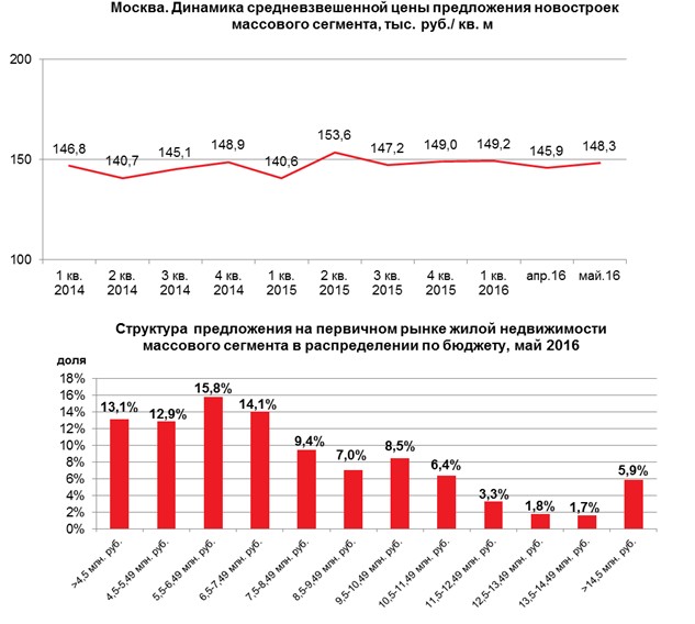 По сравнению с апрелем средневзвешенная цена в массовом сегменте выросла на 1,6% и составила 148,3 тыс. руб./кв. м. Рост цены связан с повышением стоимости в ряде проектов и выходом нового объема предложения массового сегмента в престижном Западном административном округе (дополнительный объем предложения в апарт-комплексе Match Point и новый проект "Петра Алексеева").